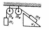 70. Несколько тел с массами m1, m2, соединены невесомыми нерастяжимыми нитями, перекинутыми через блоки массой m0. Углы, которые составляют наклонные плоскости с горизонтальной, равны α1 коэффициенты трения тел о поверхности –k. Найти ускорения, с которыми движутся тела, и силы натяжения нитей. Блоки считать однородными дисками. Трением на осях блоков пренебречь. m0 = 0,2 кг, m1 = 0,3 кг; m2 = 0,3 кг; k = 0,1; α1 = 300